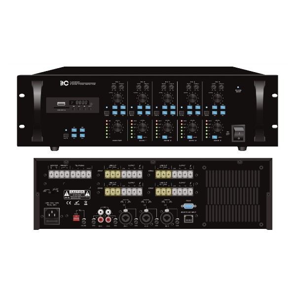 Amplificatore matrix a 4 zone con potenza d'uscita 4x60W adatto per installazioni con soluzioni multi zona. Ogni ingresso può essere facilmente indirizzato con qualsiasi combinazione a una delle quattro zone tramite i selettori digitali posti sul pannello frontale dell'apparecchio, inoltre ogni ingresso è provvisto di controlli toni alti e bassi separati, alti e controllo volume per fornire un preciso effetto sonoro ognuna delle sue 4 zone. Provvisto di 3 ingressi combinati Mic / Line / Phantom attivabili tramite selettore. Gli ingressi MIC supportano connessioni tramite jack 6,3 mm, o tramite connettore XLR. Disponibili inoltre 2 ingressi LINE con connettori RCA. E' presente un ingresso TEL ed una porta RJ45 per la connessione di un eventuale microfono con funzione paging (da acquistare separatamente). Possibilità di usufruire di un ingresso con funzione prioritaria su tutti gli altri ingressi. Uscita MONITOR per il monitoraggio audio dal luogo di installazione dell'apparecchio. L'uscita di ogni zona è inoltre provvista di una presa LINE OUT per potere collegare eventuali amplificatori di potenza. Ogni zona è provvista di uscite per la connessione di diffusori a 70 V, 100 V oppure 4 Ohm. Sul pannello frontale è disponibile un interfaccia comprendente un sintonizzatore FM, un lettore MP3 tramite ingressi USB/SD ed una connessione e Bluetooth. Le sue funzioni sono controllabili sia dall’interfaccia stessa che tal telecomando IR in dotazione. Ampie funzioni di protezione da termica, cortocircuito e sovraccarico.