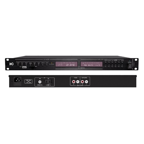 Sintonizzatore AM/FM con possibilità di memorizzazione scansione a 99 canali + 6 canali di preselezione (per ciascuna banda). Lettore CD/MP3 con ingresso USB e SD. Supporta formati CD/VCD/DVD/MP3. Sul pannello frontale sono presenti tasti funzione sia per la sezione sintonizzatore sia per quella lettore CD/MP3. L’apparecchio viene fornito con telecomando IR per gestire tutte le funzioni. Tasti funzione sintonizzatore sun pannello frontale per AM/FM, ST/MON, MEM, Sintonizzazione automatica (scansione)/Manuale (immissione diretta della frequenza), tasti preselezione. Tasti funzione lettore CD/MP3 per Eject, Play, Stop, Brano precedente, Brano successivo, Mute, USB/CD. Dotato di uscite audio stereo (Prese RCA) separate perr ogni sezione. Doppio display retroilluminato. Adatto per montaggio rack 19” (1U)