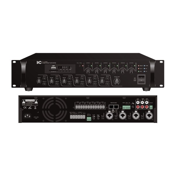 Amplificatore mixer, provvisto di 4ingressi MIC, 2 ingressi LINE con controlli separati toni alti e bassi per ogniingresso. Uscite delle 6 zone con controlli volume indipendenti. Generatore interno di segnale annuncio(Chime) e sirena allarme. 1ingresso EMC per inviare un segnale allarme proveniente da un unità esterna. Lettore MP3 con supporto CD/USB/SD. Ingressi MIC1,2,3 e 4. provvisti di alimentazione Phantom 48V con attivazione indipendente per ogni ingresso. Telecomando IR per controllare le funzioni del sintonizzatore FM e lettore MP3 USB/SD. V-U meter a led e indicatori di protezione. 5 funzioni di livello priorità. Eccellente protezione contro corto circuiti, sovraccarichi e sovratemperatura. Uscite diffusori a tensione costante 100V, 70V o a bassa impedenza 4-16 OHM