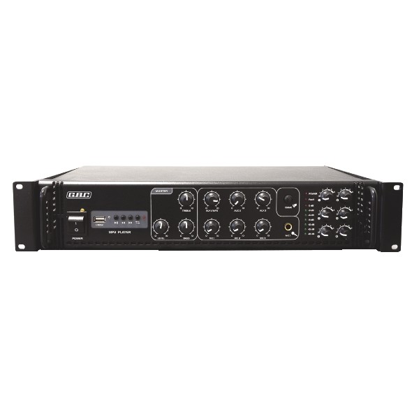 Amplificatore integrato di potenza adatto per le applicazioni Public Address più diversificate e impegnative. Terminali a vite per output 6 zone con controlli separati. Lettore MP3. Raffreddamento a ventola. 3 ingressi Mic e 3 ingressi Aux. 1 output Line. Uscita PA a 70V / 100V. Uscita 4-16 Ohm per la connessione di un sistema di altoparlanti passivo per il monitor, potenza di output massima inferiore a un terzo della potenza nominale. Connessione Mic sul pannello frontale con funzione di priorità. Dimensioni (LxAxP): 480 x 100 x 333 mm.