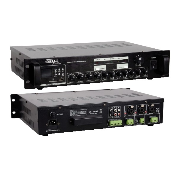 Amplificatore Professionale integrato di potenza adatto per le applicazioni Public Address più diversificate e impegnative. Terminali a vite per output 4 zone con controlli separati. Lettore USB / SD. 3 ingressi Mic XLR/6,3mm. Ingresso Phantom 48V. Ingresso Aux. Uscita REC. Uscita PRE-AMP. Ingresso AMP. Uscita PA a 70V / 100V. Uscita 4-8 Ohm per la connessione di un sistema di altoparlanti passivo. Connessione MIC con funzione di priorità. Ingresso e tasto per annunci (chime). Ingresso e tasto per allarme incendio (fire). Ingresso TEL. Ingresso allarme. VU meter. Funzione "ECHO". Controlli regolazione toni alti e bassi. Doppia alimentazione (115/230Vca - 24Vcc,10A). Dimensioni (LxAxP): 484 x 89 x 340 mm.