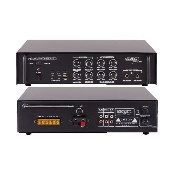 Amplificatore Professionale integrato di potenza per applicazioni Public Address. Terminali a vite. Lettore USB / SD. 2 ingressi Mic 6,3mm. 2 ingressi AUX. Uscita AUX. Uscita PA a 70V / 100V. Uscita 4-16 Ohm per la connessione di un sistema di altoparlanti passivo. Funzione "ECHO". Controlli regolazione toni alti e bassi. Doppia alimentazione (110/230Vca - 12Vcc,3A). Dimensioni (LxAxP): 360 x 85 x 290 mm.