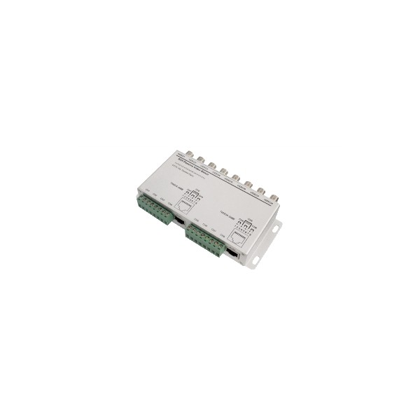 Unità passiva a 8 canali, in grado di trasmettere su cavo CAT.5, senza perdite o interferenze e su lunghe distanze (cablaggi oltre 300m. e fino a 1.500m in caso di utilizzo ricevitori video amplificati), i segnali video destinati alla videosorveglianza (Telecamere TVCC, Monitor, TV, DVR, Multiplexer). L'unità è provvista di 8 prese BNC e sulla dorsale di 2 morsettiere a 8 vie con fissaggio a viti per il collegamento del cavo rete mutipolare UTP (CAT.5 o superiori) e di 2 prese RJ45 nel caso in cui si volessero utilizzare cavi UTP già intestati con connettori 8 poli.