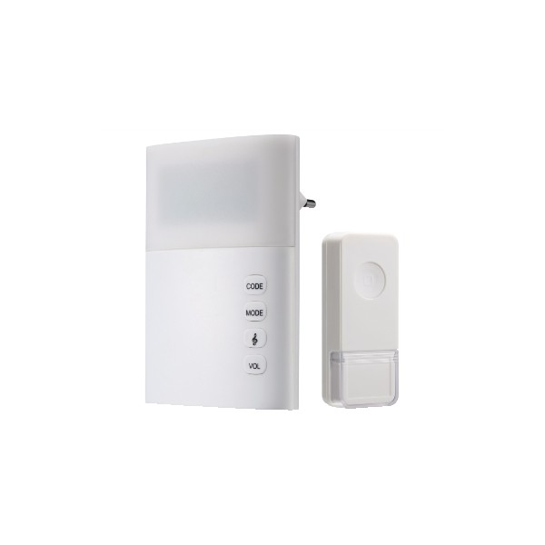 Campanello senza fili composto da un'unità trasmittente con grado di protezione IP44 alimentata a batteria e da una ricevente alimentata a 230V 50Hz.