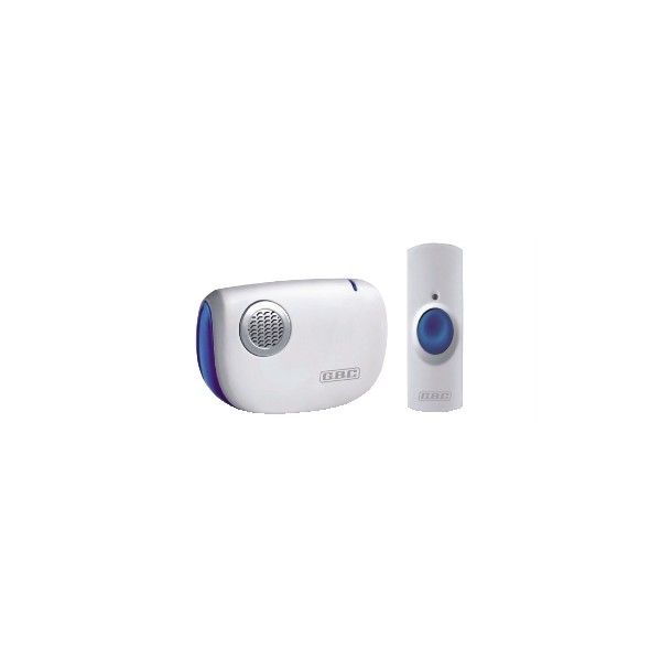 Campanello senza fili composto da un'unità trasmittente con grado di protezione IP44 e da una ricevente, entrambe alimentate a batterie. Il trasmettitore invia via radio un impulso al ricevitore che attiva la suoneria ed un LED di colore blu. E' Plug&Play, non è richiesta alcuna impostazione in quanto il radiocomando ed il campanello vengono accoppiati in fabbrica.