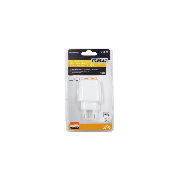 Alimentatore per iSeries e Tablet PC (ingresso 100 - 240Vca 50/60Hz) con doppia uscita USB, 5Vcc 2,4A. Leggerissimo, elegante, ingombro minimo, massima praticità e flessibilità d'uso. Maggiore potenza per l'alimentazione dei più recenti modelli di iPad. Utilizzando una sola uscita eroga 2,4A, usando le due uscite contemporanemante 1,2A per uscita. Compatibile con tutte le principali marche di Tablet PC, e con iPad 1° gen., 2° gen., 3° gen., 4° gen., iPad Mini, iPad Mini con Display Retina e iPad Air, oltre che con tutti gli iPhone e iPod.