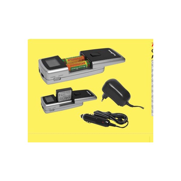 Caricabatteria per batterie foto/video camera Li-Ion, Li-PO, AA/AAA Ni-MH/Ni-CD. Dotato dell'alimentatore da casa e del cavo accendisigari da auto, è possibile caricare tutti i tipi di batterie per foto/video camera grazie ai contatti posizionati su slitta e al riconoscimento automatico della polarità della batteria. E' in grado di caricare contemporaneamente 2 batterie AA o AAA e una batteria per foto/video camera. Tramite la porta USB di uscita, è possibile utilizzarlo anche come power bank.