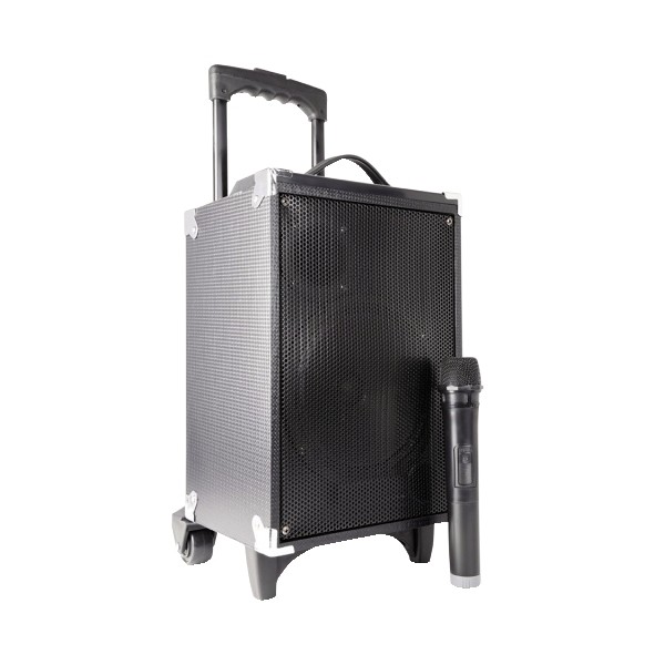 Tutta la tua musica ovunque vuoi, e subito. Questo sistema audio di amplificazione / diffusione integra un amplificatore, ingressi audio, porta USB, slot per MicroSD/TF, e un microfono wireless VHF. Grazie alla connessione Blue Tooth puoi connetterti in streaming ai tuoi dispositivi mobili, o usare il lettore MP3 integrato. Completo di batterie ricaricabili agli ioni di litio da 4400mAh. Perfetto per musicisti, animatori, e organizzatori di eventi.