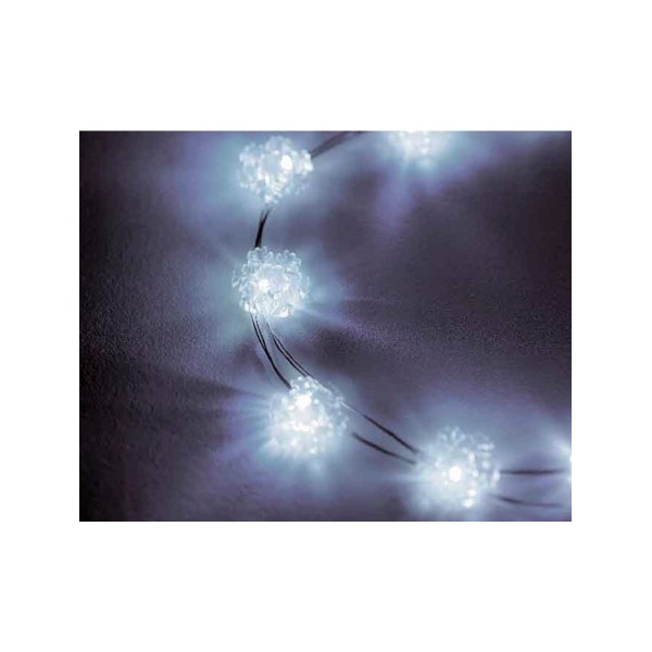 Catena microled fiocchi di neve, adatta a decorazioni di piccoli alberi di Natale o a creare punti luce per vasi, tavoli, ecc.. A luce fissa. Con timer 6h. A batteria. Durata delle batterie 48h circa. Uso interno.