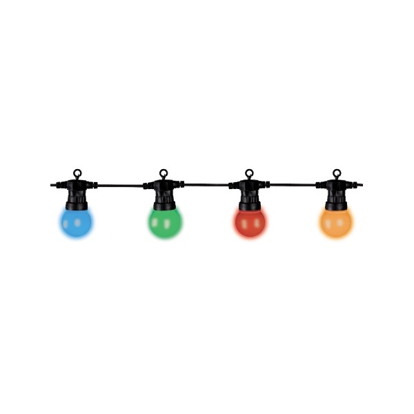Kit estenzione catena lampadine LED colorate, con connettori di inizio e fine in dotazione. Trasformatore IP44 8 giochi di luce selezionabili. Prolungabile fino a 5 set, 100 LED. Uso esterno.
