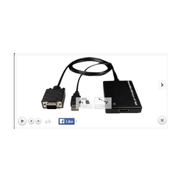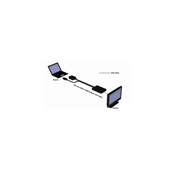 Consente la conversione del segnale VGA in uscita da una normale scheda video per PC o NoteBook in HDMI. Dispone inoltre di connettore USB per la ricezione del segnale audio, convogliato sulla stessa uscita HDMI in digitale, e per l'alimentazione del convertitore stesso. Supporta risoluzioni VGA fino a 1280x1024. E' perciò possibile visualizzare su TV/Monitor/Videoproiettori in HD con ingresso HDMI l'immagine proveniente da PC e NoteBook, usufruendo contemporaneamente del suono convertito in digitale. Ideale per presentazioni.