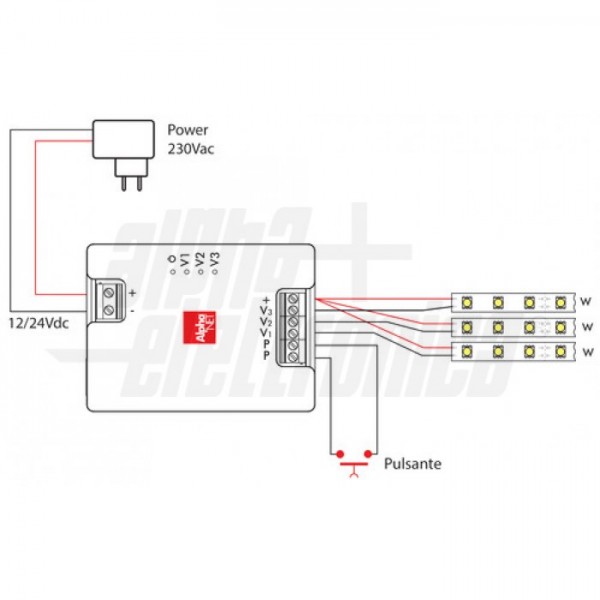 Dimmer monocolore per nastri led e sorgenti led resistive a tensione costante 12V oppure 24V. Il controllo dell’intensità luminosa viene eseguito tramite pulsante generico opportunamente installato ai morsetti PP. Pulsante non fornito.