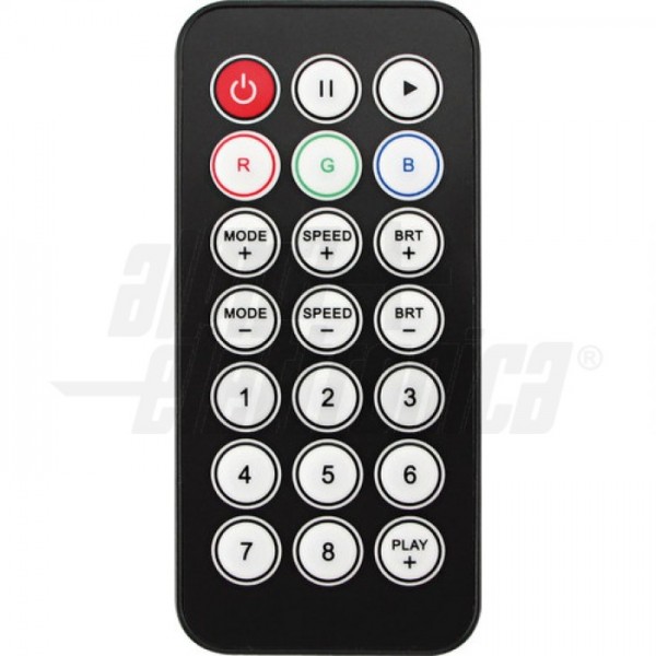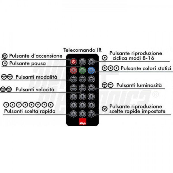 L'apposito telecomando IR consente il controllo dell'intensità luminosa, dei modi di funzionamento oltre che il controllo on/off delle sorgenti led collegate. Con la centralina è possibile realizzare effetti di illuminazione statici oppure dinamici impostando i modi di funzionamento prestabiliti.
