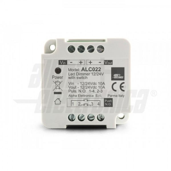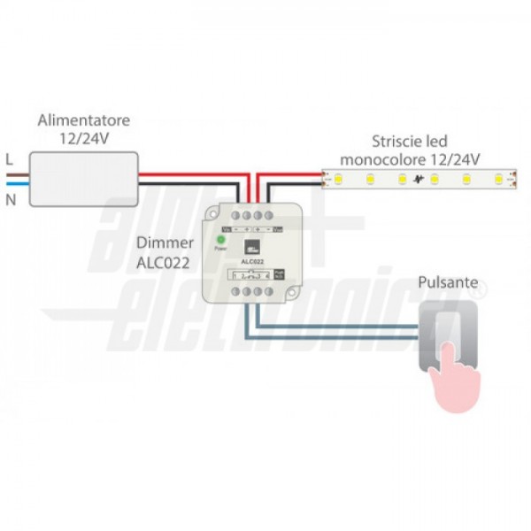 Dimmer monocolore per strisce led e sorgenti led resistive a tensione costante 12V oppure 24V. Il controllo dell’intensità luminosa viene eseguito tramite pulsante generico opportunamente installato ai morsetti PP. Pulsante non fornito.
