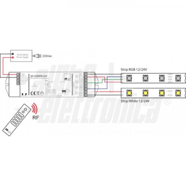 Questo controller funziona da ricevitore per opportuni telecomandi a radio frequenza attraverso i quali è possibile comandare la scelta dei colori e dell’intensità nel caso di nastri RGBW, dell'intensità e della temperatura di colore (CCT) nel caso di nastri led bianchi bicolore o della sola intensità nel caso di nastri monocolore.