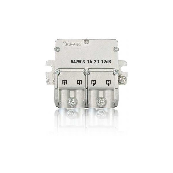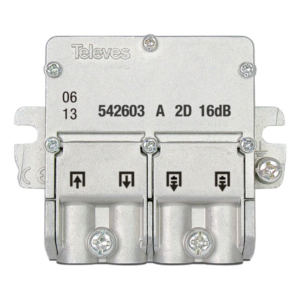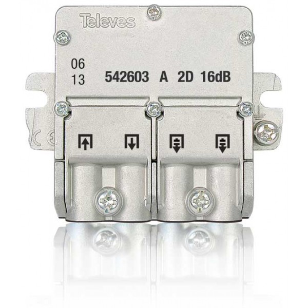 Derivatore mini da 2 derivazioni con sistema di connessione EasyF, per segnali SMATV. Con la sua perdita di derivazione (16dB), si raccomanda la sua installazione ai piani 2 e 3 (tipo A).