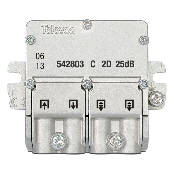 Derivatore mini da 2 derivazioni con sistema di connessione EasyF, per segnali SMATV. Con la sua perdita di derivazione (25dB), si raccomanda la sua installazione ai piani 7 a 12 (tipo C).