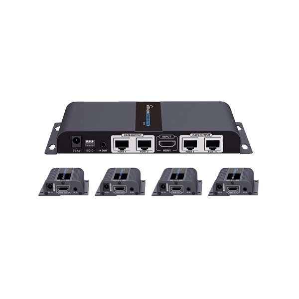 Composto da un trasmettitore con 4 uscite RJ45 e 4 ricevitori, amplifica il segnale HDMI, molto sensibile alla dispersione dovuta alla lunghezza eccessiva dei cavi (che non dovrebbero mai superare i 15m) e lo trasferisce fino ad una distanza massima di 40m. Supporta risoluzioni fino a FullHD 1080p; utilizza 1 singolo cavo di rete cat. 6 o 7 per uscita. Ampiezza di banda 2,25Gbps per canale (6,75Gbps in totale). Ideale per inviare il segnale HD su più display contemporaneamente, in centri di controllo sicurezza, sale proiezioni, sale conferenze, fiere, negozi, uffici in genere, etc. Risolve il problema del passaggio dei cavi HDMI nelle canaline già esistenti. L'uscita HDMI passante (loopout) del trasmettitore consente la connessione anche a un display HD di prossimità. Integra un ripetitore di telecomando IR, per gestire in remoto decoder satellitari e lettori Blu-ray. Grazie alla tecnologia POE (Power Over Ethernet) il ricevitore non ha bisogno di essere alimentato. Integra switch EDID per la gestione del segnale HDMI.