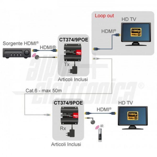 L'extender è dotato di splitter interno (funzione Loopout) per la connessione di un monitor al trasmettitore oltre che un monitor al ricevitore. Supporta la trasmissione del segnale infrarosso (IR) del telecomando della sorgente HDMI connessa.