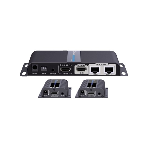 Composto da un trasmettitore con 2 uscite RJ45 e 2 ricevitori, amplifica il segnale HDMI, molto sensibile alla dispersione dovuta alla lunghezza eccessiva dei cavi (che non dovrebbero mai superare i 15m) e lo trasferisce fino ad una distanza massima di 40m. Supporta risoluzioni fino a FullHD 1080p; utilizza 1 singolo cavo di rete cat. 6 o 7 per uscita. Ampiezza di banda 2,25Gbps per canale (6,75Gbps in totale). Ideale per inviare il segnale HD su più display contemporaneamente, in centri di controllo sicurezza, sale proiezioni, sale conferenze, fiere, negozi, uffici in genere, etc. Risolve il problema del passaggio dei cavi HDMI nelle canaline già esistenti. L'uscita HDMI passante (loopout) del trasmettitore consente la connessione anche a un display HD di prossimità. Integra un ripetitore di telecomando IR, per gestire in remoto decoder satellitari e lettori Blu-ray. Grazie alla tecnologia POE (Power Over Ethernet) il ricevitore non ha bisogno di essere alimentato. Integra switch EDID per la gestione del segnale HDMI.