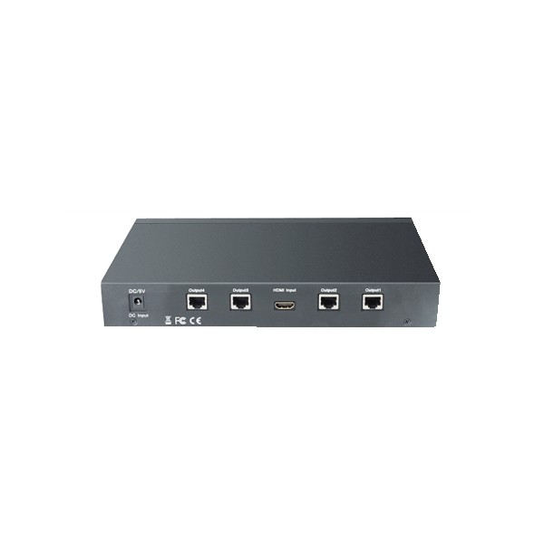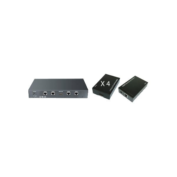 - Kit composto da trasmettitore con splitter 4 porte integrato (4 uscite RJ45) e 4 ricevitori con ingresso RJ45 e uscita HDMI.