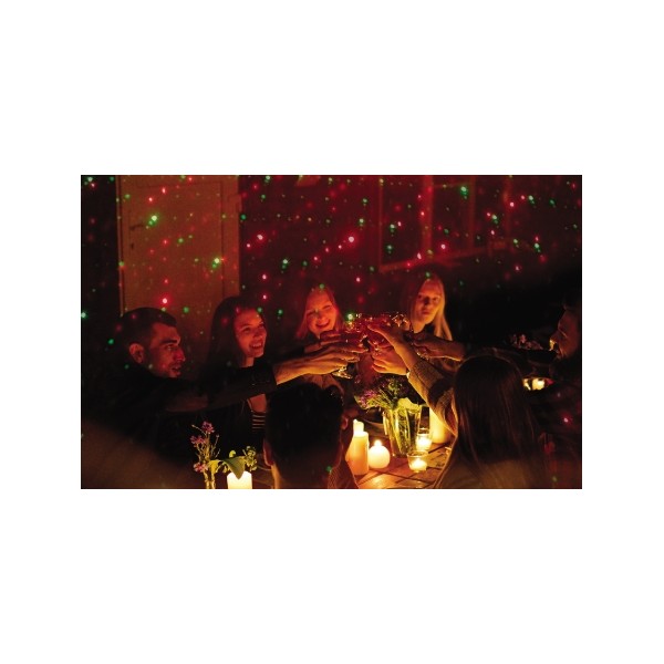 Laser grafico a due colori (rosso e verde) in classe 2 per interni ed esterni (IP44) con effetto luminoso "1000 stars" . Proietta stelle luminose su qualsiasi superficie (max 225mq a 9m) al chiuso o all'aperto (muri, alberi, teli etc). La resa visiva cala all'aumentare della luminosità esterna. Funzione timer incorporata: il laser si spegne automaticamente dopo 6 ore, e si riaccende il giorno successivo alla stessa ora. Potenza: G (650nm) 3,67mW, R (532nm) 2,82mW. Alimentatore da esterni incluso. Staffa di sostegno da interni e paletto da giardino inclusi. Perfetto per allestimenti e addobbi per festività, per feste private e pubbliche, per grandi superfici. Temperatura di esercizio -15 - +35° (con pre-riscaldamento). Dimensioni 180 x 130mm. Peso 0,5Kg. Certificato EN60825. Batteria opzionale 70.1756.83.