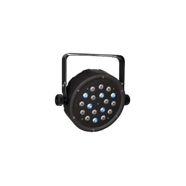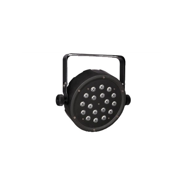 Faretto a LED RGB Parcan. Per uso professionale con finiture di alto livello per inserimento in contesti di prestigio. 18 LED RGB (6x6x6 x1W) per 758lm di emissione. Controllato via DMX512. Refresh rate 1200Hz. Dimmer da 0 a 100%. Strobo 1 - 20Hz. Angolo di illuminazione 25°. DMX 512 3, 6 canali. Consumo max 20W. Dimensioni 288x270x113mm. Peso 1,4Kg. Scocca plastica anti-fiamma. Raffreddamento a ventola.
