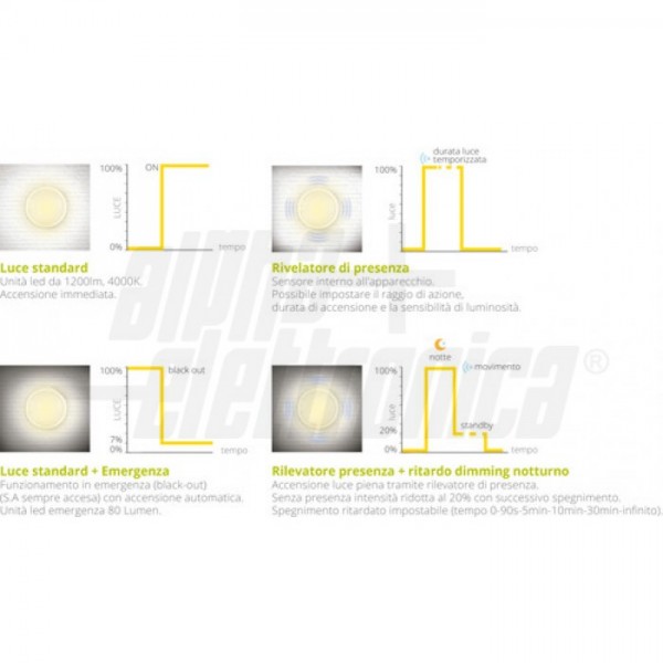 Apparecchio led con sensore di movimento a microonde. La plafoniera funziona anche da lampada d'emergenza, grazie alla sua batteria da 1500mA garantisce una autonomia di 5 ore in caso di assenza di rete domestica. Installazione a plafone o a parete in applicazioni interne o esterne.