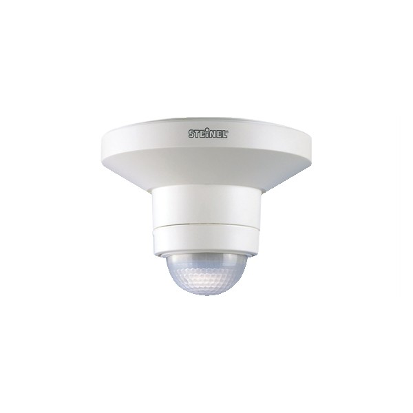 Sensore a raggi infrarossi per montaggio a soffitto, ideale per il rilevamento totale sotto soffitti, pensiline, box auto, sporgenze del tetto o balconi. Dotato di tre rilevatori a raggi infrarossi estremamente sensibili disposti l'uno rispetto all'altro in una speciale angolatura e permette una sorveglianza affidabile e totale delle superfici che si trovano sotto di esso per un'area a 350M2. Possibilità di limitazione del campo di rilevamento per mezzo delle calotte di copertura fornite in dotazione. Semplice impostazione della durata del periodo di illuminazione e della soglia di luce crepuscolare attraverso regolatori rotativi. Vano per l'allacciamento elettrico ben disposto ai fini di un cablaggio semplice e rapido.