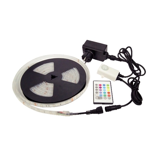 Striscia IP68 con 150 led RGB SMD 5050. Ideale per decorazioni esterne, vetrine, segnaletica ecc. Bassissimo consumo / lunga durata. Adattatore IP44, RGB controller IP44 e telecomando a infrarossi in dotazione per utilizzo plug & play.