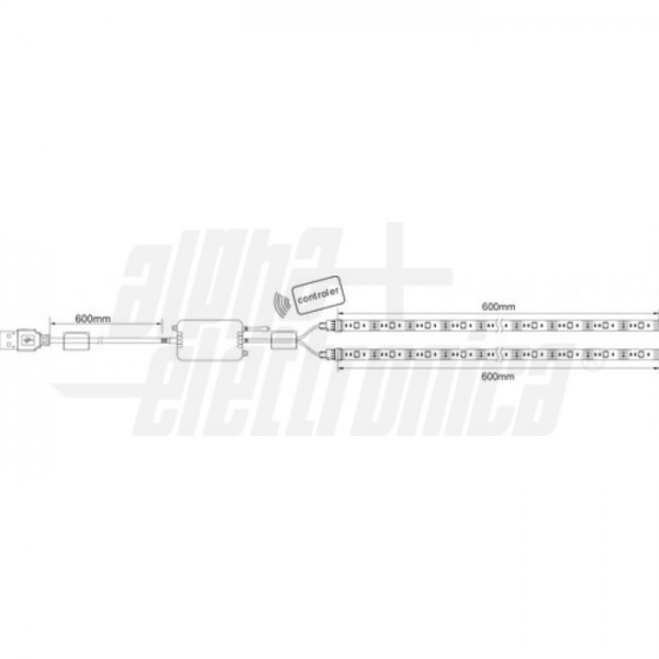 Kit di illuminazione lineare multicolore RGB per effetti di luce soffusa e riposante adatto per ambienti domestici. Il kit include due nastri led ad alta intensità multicolore RGB dotati di bi-adesivo, cavo di alimentazione USB 5V, controller con telecomando multifunzione con il quale è possibile modificare i colori e l'intensità della luce emessa dal nastro led.