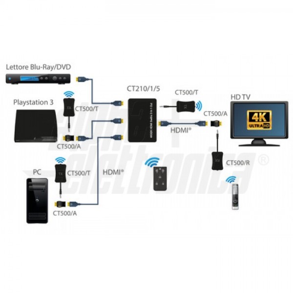 Grazie all'innovativa tecnologia IR over HDMI consente di controllare le funzioni delle sorgenti (ad esempio la funzione Play, Pausa, Stop) tramite il telecomando originale della sorgente e di selezionare la sorgente desiderata tramite il telecomando in dotazione.