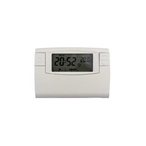 Termostato che può sostituire la maggior parte dei termostati di uso domestico. Da utilizzarsi per impianti di riscaldamento e condizionamento. Visualizzazione orologio e della temperatura ambiente. Ogni programma giornaliero è suddiviso in 24 ore. Sportellino copri comandi richiudibile.