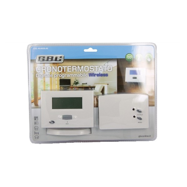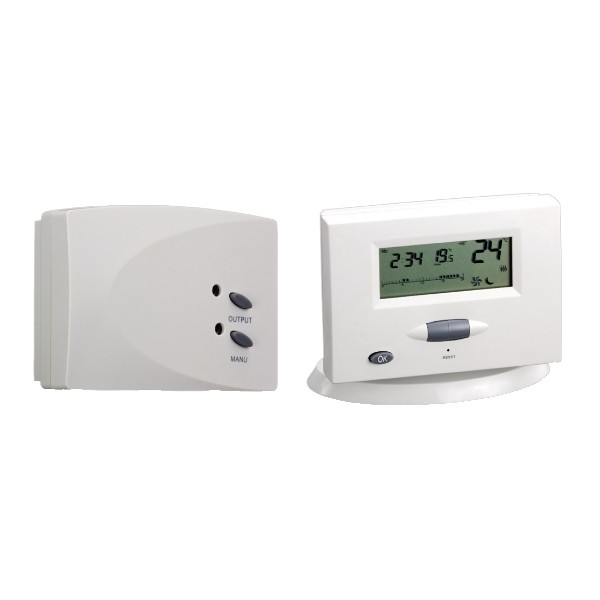 Termostato che può sostituire la maggior parte dei termostati di uso domestico. Da utilizzarsi per impianti di riscaldamento e condizionamento. Trasmettitore a radiofrequenza installabile a muro oppure su tavolo con base di appoggio nella stanza desiderata. Visualizzazione orologio e della temperatura ambiente. Ogni programma giornaliero è suddiviso in 24 ore. Facile programmazione "One Touch Roller".