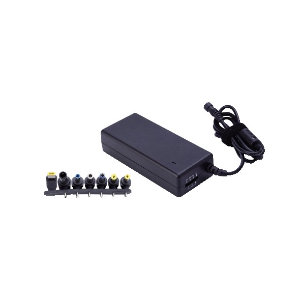 Alimentatore switching per NoteBook a tensione variabile da 15 a 24Vcc potenza 70W con 7 spinotti intercambiabili. Supporta tensioni di: 15 / 16 / 18,5 / 19,5 / 20 / 22 / 24Vcc. Potenza massima 70W (da 4,67 a 2,9A). Gli spinotti intercambiabili consentono l'uso con le più note marche di NoteBook (Toshiba; HP/Compaq; Fujitsu; Acer; IBM; Lenovo; Dell). Dotato di funzione di controllo del sovraccarico e del surriscaldamento, e di protezione da cortocircuito.