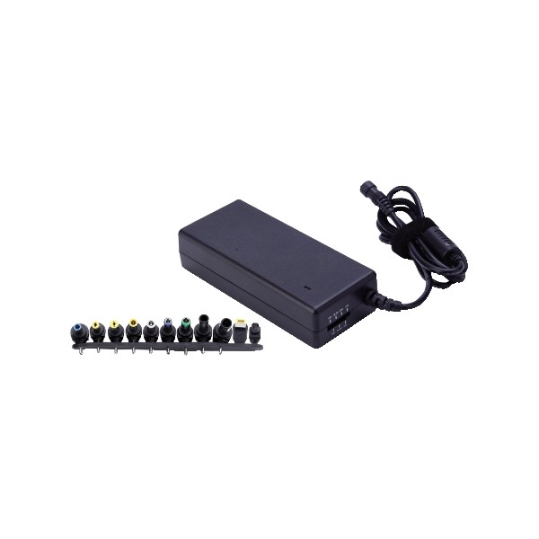 Alimentatore switching per NoteBook a tensione variabile da 15 a 24Vcc, potenza 90W con 11 spinotti intercambiabili. Supporta tensioni di: 15 /16 / 18,5 / 19,5 / 20 / 22 / 24Vcc. Potenza massima 90W (da 6 a 3,75A). Gli spinotti intercambiabili consentono l'uso con le più note marche di NoteBook (Sony, Samsung, Sharp; NEc; Toshiba; HP/Compaq; Compaq; Acer; Delta; IBM; LiteOn; Gateway; Dell; Apple; HP). Dotato di funzione di controllo del sovraccarico e del surriscaldamento, e di protezione da cortocircuito.